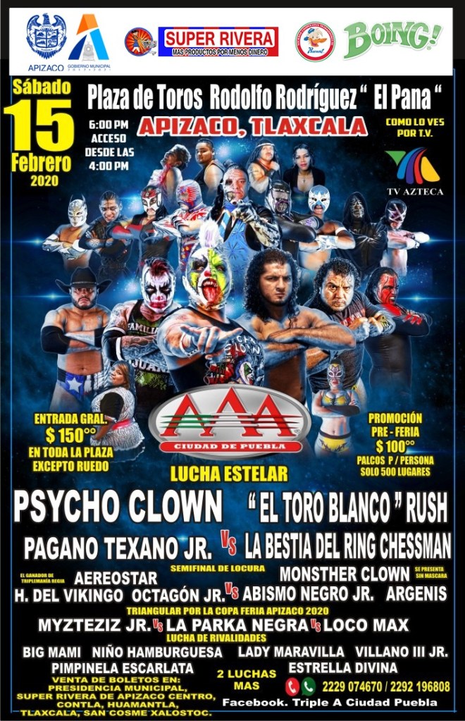 El próximo sábado 15 de febrero, en la ciudad rielera, se llevará a cabo una función de lucha libre AAA, con la presentación de Psycho Clown, El Toro Blanco Rus, Pagano Texano Jr., la Bestia del Ring Chessman, en la lucha estelar.