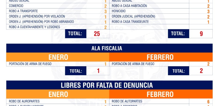 La corporación detalló que, durante el mes de enero, 25 fueron las puestas al MP, 151 ante el Juez Municipal, 1 ante la Fiscalía, mil 347 infracciones al reglamento y 37 accidentes viales, en ese mismo mes, 2 personas no realizaron su denuncia correspondiente, una, víctima de robo de autopartes y otra por robo a cuentahabiente.