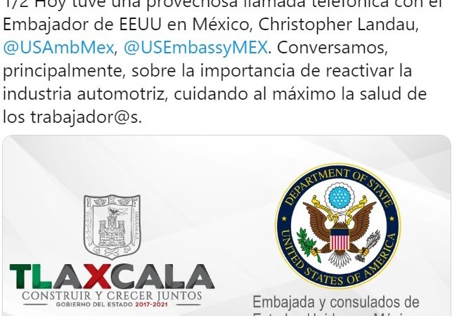 Marco Mena escribió: “1/2 Hoy tuve una provechosa llamada telefónica con el Embajador de EEUU en México, Christopher Landau, @USAmbMex, @USEmbassyMEX. Conversamos, principalmente, sobre la importancia de reactivar la industria automotriz, cuidando al máximo la salud de los trabajador@s”.