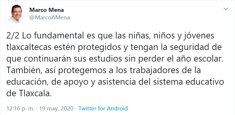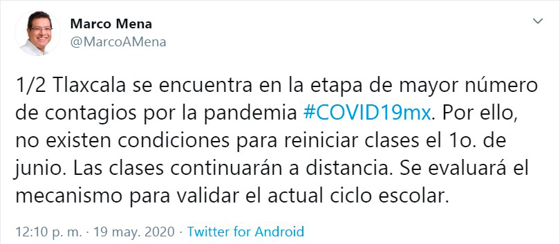 En sus perfiles de Twitter y Facebook, el Gobernador Marco Mena escribió: “1/2 Tlaxcala se encuentra en la etapa de mayor número de contagios por la pandemia #COVID19mx. Por ello, no existen condiciones para reiniciar clases el 1o. de junio. Las clases continuarán a distancia. Se evaluará el mecanismo para validar el actual ciclo escolar”.
