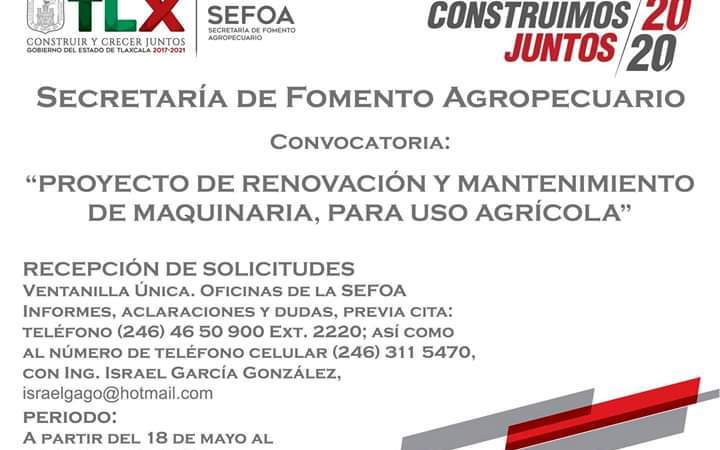 Para mayores informes será en la oficina de desarrollo municipal o al teléfono 24 14 15 41 34, también en la oficina de la secretaria de fomento agropecuario; la convocatoria para el proyecto de renovación y mantenimiento de maquinaria para uso Agrícola.