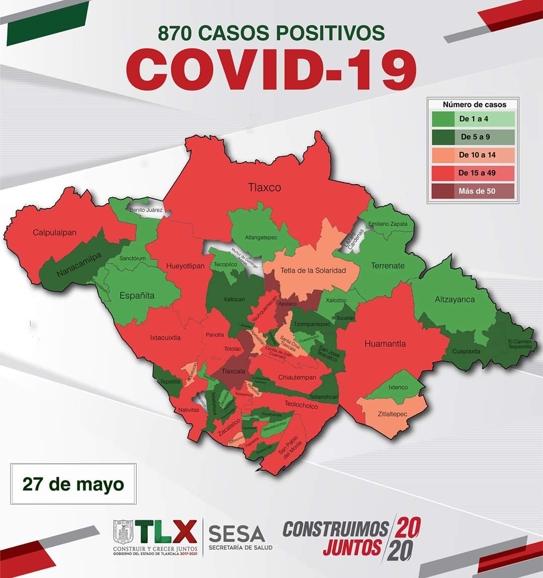 Hasta este momento, Tlaxcala registra 137 casos, Apizaco 76, Chiautempan 47, San Pablo del Monte y Huamantla 40, Zacatelco 39, Calpulalpan 32, Yauhquemehcan 28, Contla 26, Nativitas 23, Ixtacuixtla 22, Hueyotlipan y Panotla 21, Papalotla 19, Tlaxco 17; Totolac 16, Tepeyanco y Teolocholco suman 15, Santa Ana Nopalucan 14.