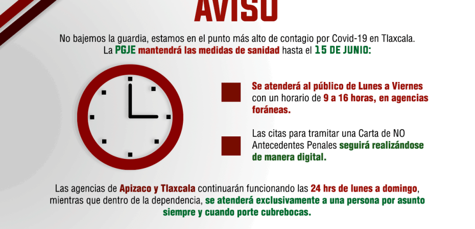 Además, todas las agencias del Ministerio Público permanecerán abiertas de 09:00 a 16:00 horas y cuentan con la información preventiva necesaria para mantener una sana distancia, así como material para la limpieza de manos.