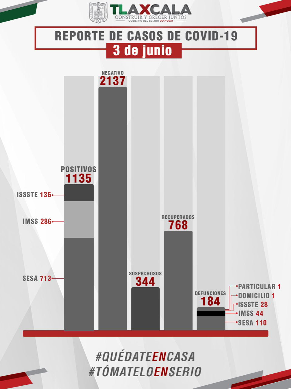 De esta manera, la entidad registra 768 personas recuperadas, mil 135 casos positivos y 184 fallecimientos.