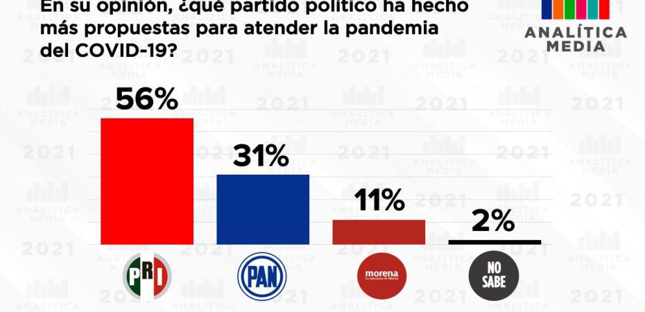 El estudio señala que a la pregunta: en su opinión, ¿qué partido político ha hecho más propuestas para atender la pandemia del COVID-19?, el 56 por ciento de los encuestados respondió que el PRI; 31, PAN; 11, Morena y el 2 por ciento “no sabe”.