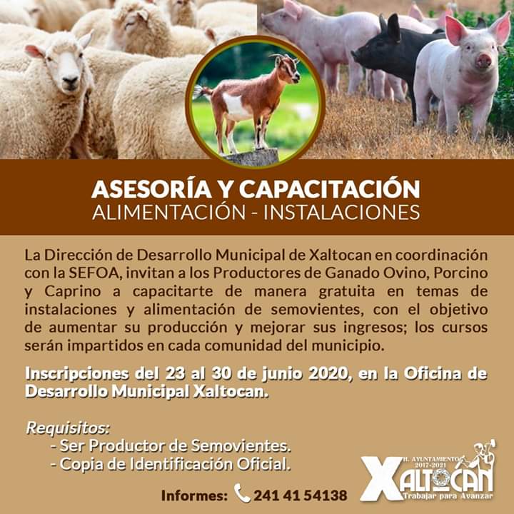 El presidente municipal de Xaltocan, Eugenio Sánchez Amador, a través de la dirección de desarrollo municipal de Xaltocan, en coordinación con la SEFOA, invitan a los productores de ganado ovino, porcino y caprino, a capacitarte de manera gratuita en temas de instalaciones y alimentación de semovientes, con el objetivo de aumentar su producción y mejorar sus ingresos; los cursos serán impartidos en cada comunidad del municipio.