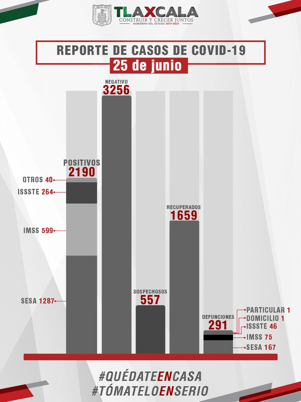 Hasta este momento, Tlaxcala registra 382 casos, Chiautempan 197, Apizaco 194, Huamantla 132, Zacatelco 130, Yauhquemehcan 74, Contla 73, San Pablo del Monte 71, Totolac 51, Calpulalpan 49, Papalotla 48, Apetatitlán 40, Ixtacuixtla 38, Panotla 37, Hueyotlipan y Tetla 33, Santa Cruz Tlaxcala y Tlaxco 32; Nativitas, Teolocholco y Tepetitla de Lardizabal 30, Cuapiaxtla 26, Tepeyanco 24, Xicohtzinco 23, Santa Ana Nopalucan 22.