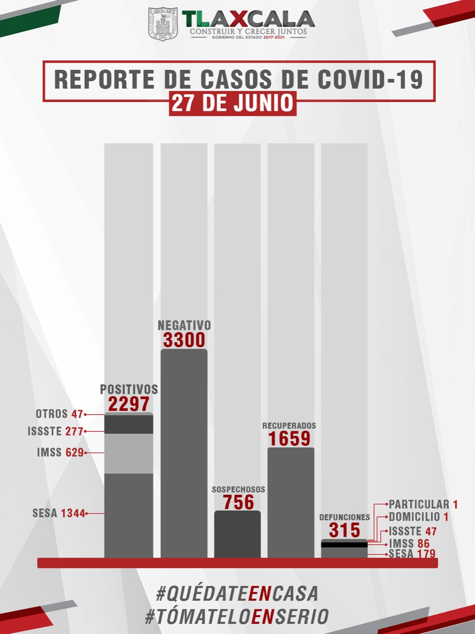 De esta manera, la entidad registra mil 659 personas recuperadas, dos mil 297 casos positivos y 315 fallecimientos.