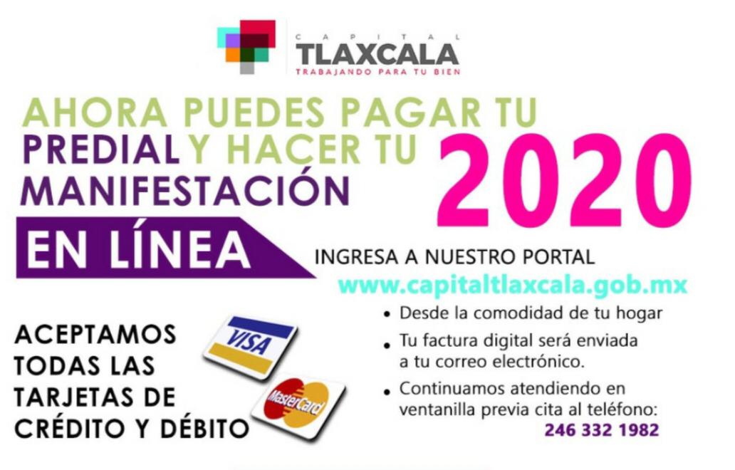 El Ayuntamiento de Tlaxcala pone a disposición de los usuarios el método de pago en línea para que con su tarjeta de crédito o débito puedan pagar el impuesto predial y la manifestación catastral sin necesidad de acudir a las oficinas municipales, al banco o cajeros automáticos.