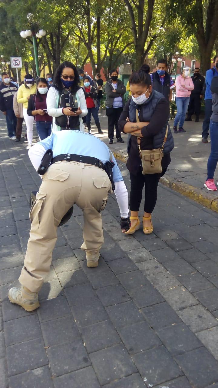 La Dirección de Seguridad Pública del ayuntamiento de Tlaxcala, refuerza acciones preventivas de salud e higiene entre usuarios que se encuentran al exterior de sucursales bancarias de la capital con el objetivo de evitar contagios de coronavirus.