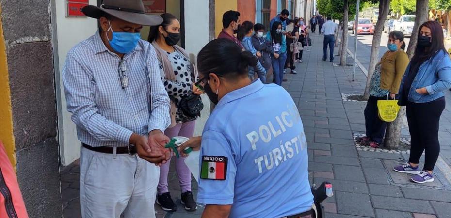 De este modo, elementos de la Policía Turística de la capital hacen presencia en sucursales bancarias y en establecimientos con servicios de cajero automático como Telmex y servicios de cable para vigilar que cuentahabientes adopten las recomendaciones de mantener distancia de dos metros con los demás usuarios y acudir solos a realizar sus trámites.