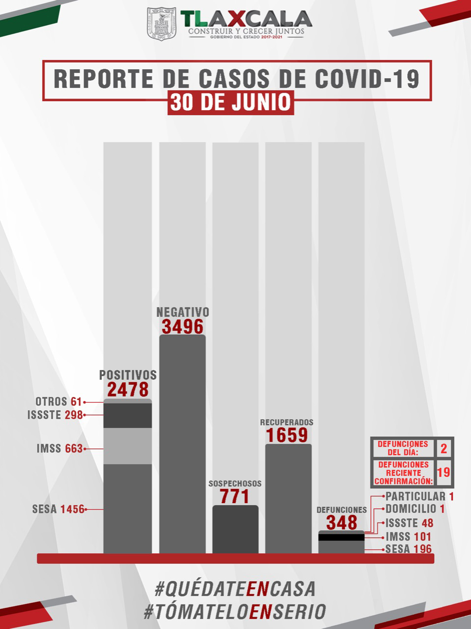 El titular de la SESA informó que el estado registra, hasta este momento, dos mil 478 casos positivos, mil 659 personas recuperadas, 348 defunciones, 3 mil 496 casos negativos y 771 se encuentran en espera de resultado.