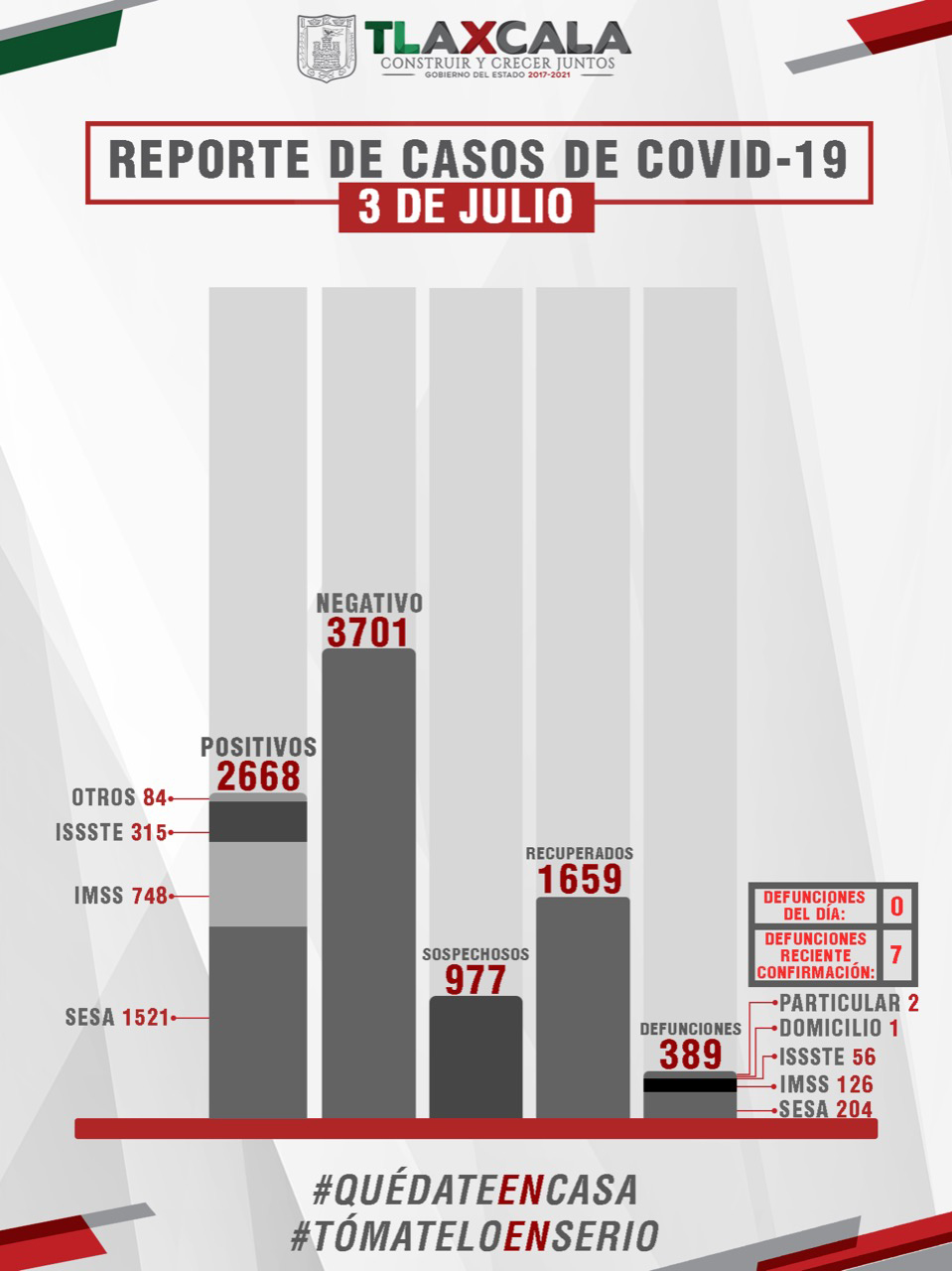 De esta manera, la entidad registra mil 659 personas recuperadas, dos mil 668 casos positivos y 389 fallecimientos.