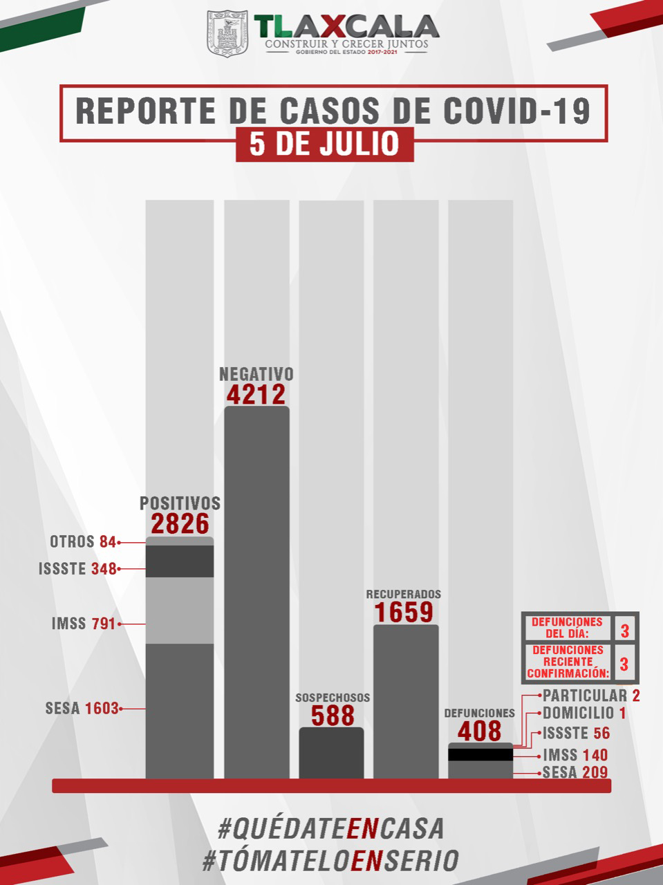De esta manera, el estado registra mil 659 personas recuperadas, dos mil 826 casos positivos y 408 fallecimientos.