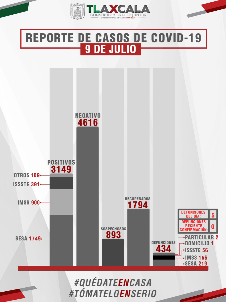 De esta manera, el estado registra mil 794 personas recuperadas, tres mil 149 casos positivos y 434 fallecimientos.