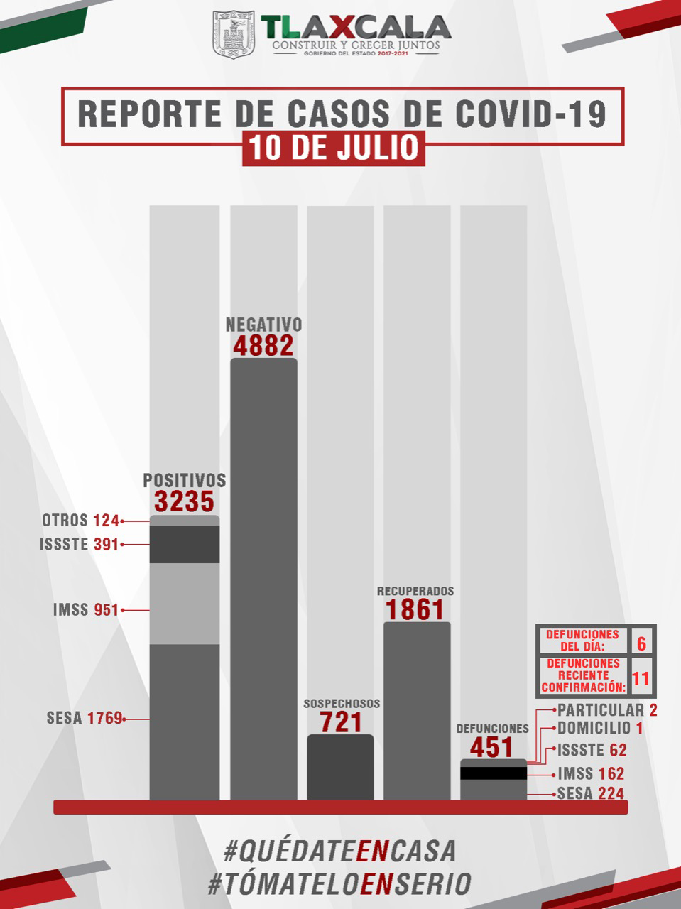 De esta manera, el estado registra mil 861 personas recuperadas, tres mil 235 casos positivos y 451 fallecimientos.