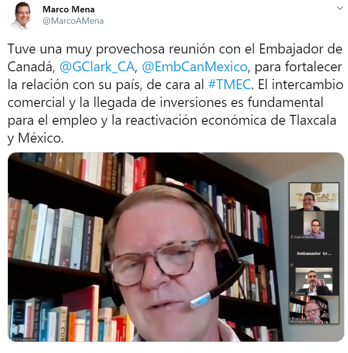 En Twitter y Facebook, Marco Mena informó del encuentro con el diplomático: «Tuve una muy provechosa reunión con el Embajador de Canadá, @GClark_CA, @EmbCanMexico, para fortalecer la relación con su país, de cara al #TMEC. El intercambio comercial y la llegada de inversiones es fundamental para el empleo y la reactivación económica de Tlaxcala y México»