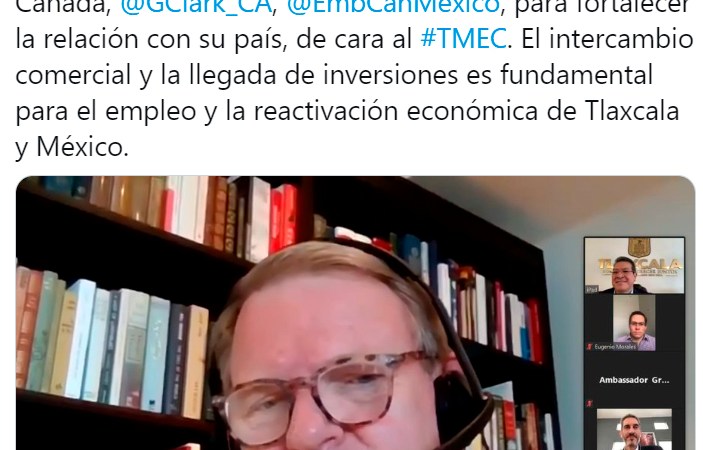 En Twitter y Facebook, Marco Mena informó del encuentro con el diplomático: «Tuve una muy provechosa reunión con el Embajador de Canadá, @GClark_CA, @EmbCanMexico, para fortalecer la relación con su país, de cara al #TMEC. El intercambio comercial y la llegada de inversiones es fundamental para el empleo y la reactivación económica de Tlaxcala y México»
