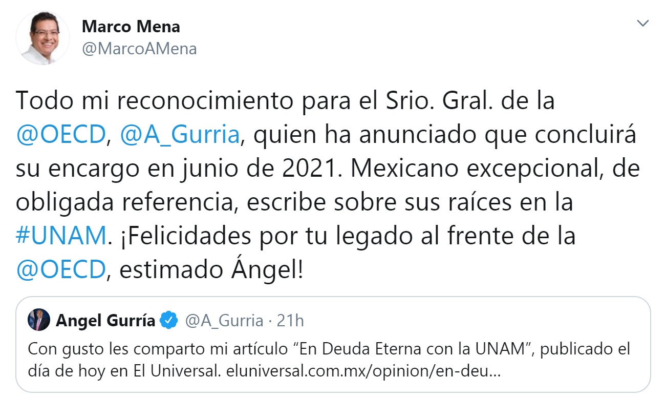 En su cuenta de Twitter, el Gobernador Marco Mena escribió: “Todo mi reconocimiento para el Srio. Gral. de la @OECD, @A_Gurria, quien ha anunciado que concluirá su encargo en junio de 2021. Mexicano excepcional, de obligada referencia, escribe sobre sus raíces en la #UNAM. ¡Felicidades por tu legado al frente de la @OECD, estimado Ángel!”.