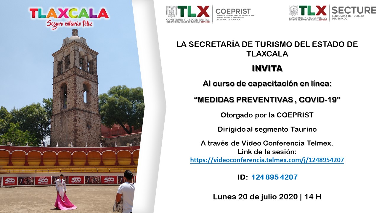 La Secretaría de Turismo del Estado (Secture) y la Comisión Estatal para la Protección Contra Riesgos Sanitarios del Estado de Tlaxcala (Coeprist) invitan a prestadores de servicios turísticos a las capacitaciones en línea “Medidas Preventivas, Covid-19″, que tienen como objetivo que el sector cuente con las herramientas necesarias para la reapertura de sus comercios ante la nueva normalidad.