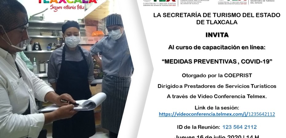 La Secretaría de Turismo del Estado (Secture) y la Comisión Estatal para la Protección Contra Riesgos Sanitarios del Estado de Tlaxcala (Coeprist) invitan a prestadores de servicios turísticos a las capacitaciones en línea “Medidas Preventivas, Covid-19″, que tienen como objetivo que el sector cuente con las herramientas necesarias para la reapertura de sus comercios ante la nueva normalidad.