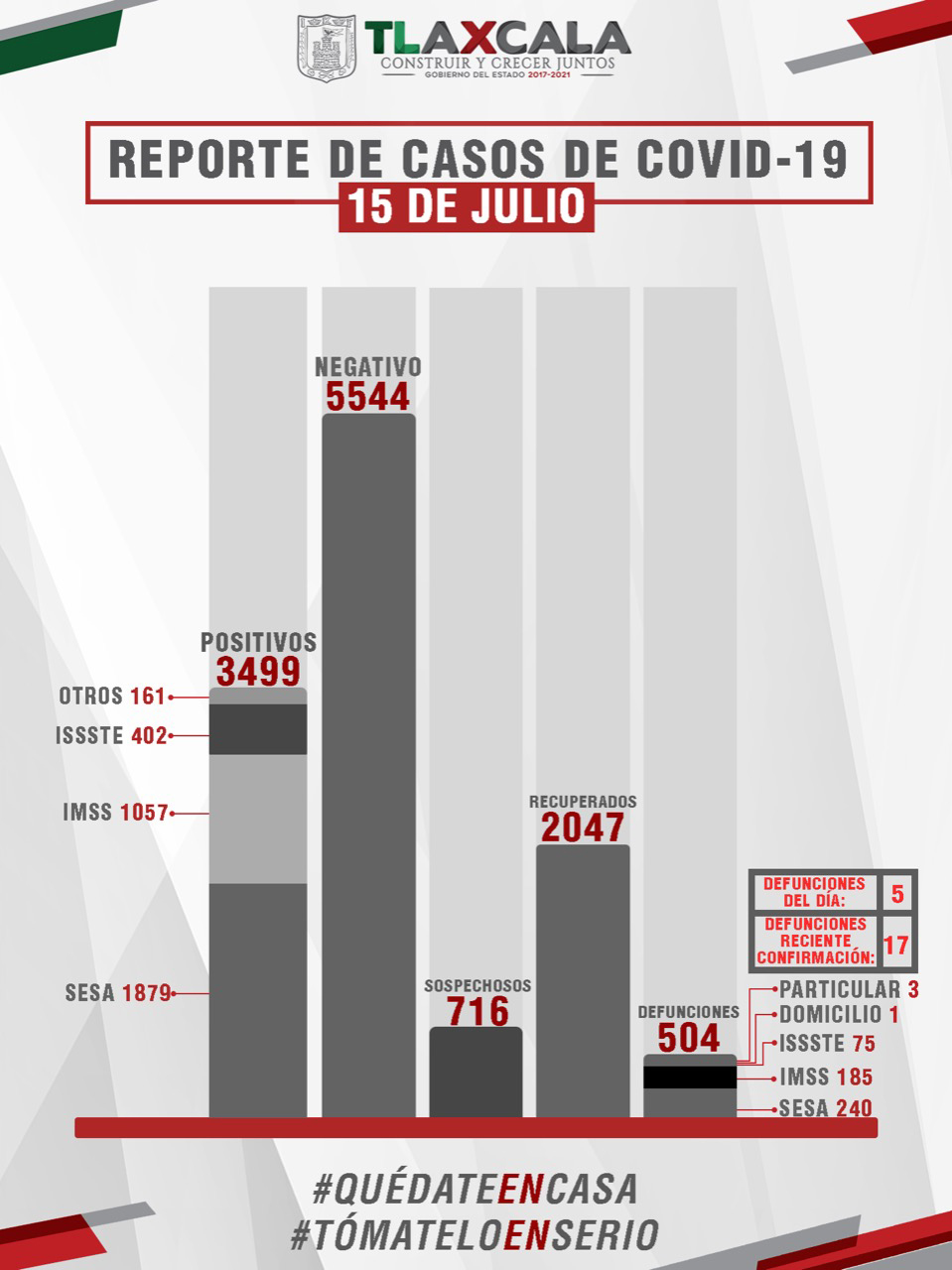 De esta manera, el estado registra dos mil 47 personas recuperadas, tres mil 499 casos positivos y 504 fallecimientos.