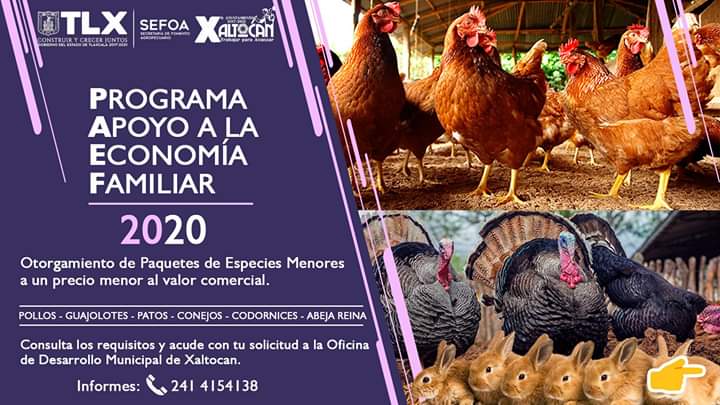 El municipio de Xaltocan, que preside en la administración 2017-2021 Eugenia Sánchez Amador, busca proporcionar a la población paquetes de especies menores de aves de postura como pollo de engorda, conejos, patos, guajolotes criollos, codorniz y abejas, todos estos apoyos son con la finalidad de que coadyuven a mejorar su dieta.
