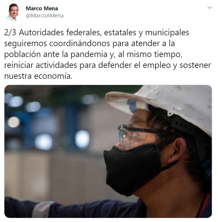 En un segundo mensaje, informó: «2/3 Autoridades federales, estatales y municipales seguiremos coordinándonos para atender a la población ante la pandemia y, al mismo tiempo, reiniciar actividades para defender el empleo y sostener nuestra economía».