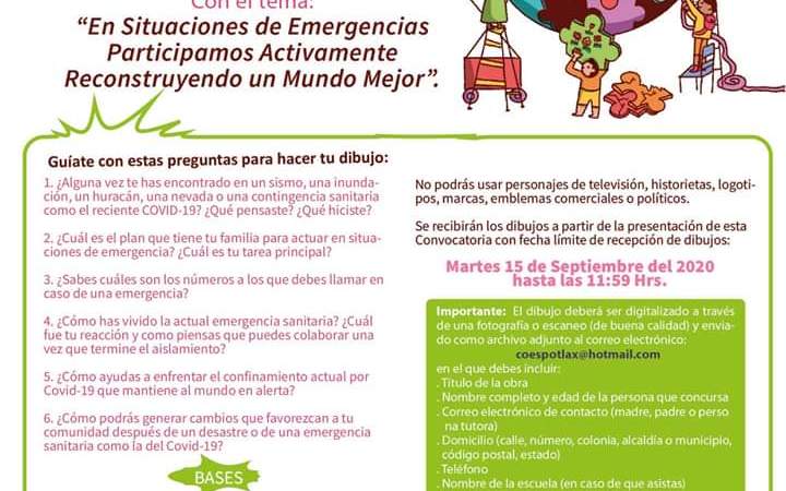 Podrán participar niñas y niños, adolescentes y jóvenes de 6 a 24 años; en 5 categorías, señalando que podrán participar todos aquellos recidentes del estado de Tlaxcala, para este año, se recibirán los trabajos hasta el 15 de septiembre del presente año, el gobierno del Estado, marco el tema «En Situaciones de Emergencias Participamos Activamente Reconstruyendo un Mundo Mejor».