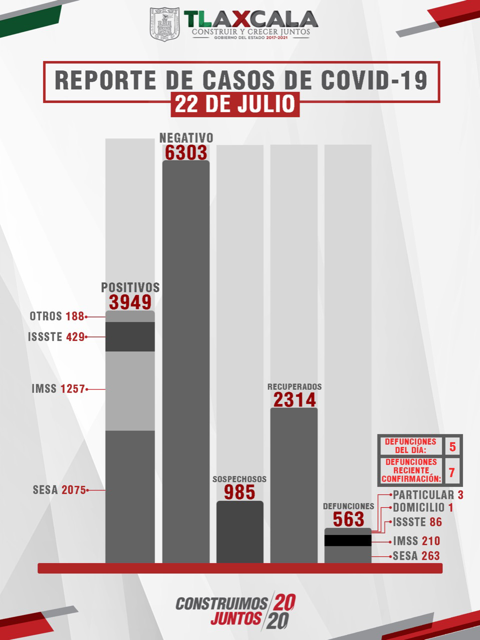 De esta manera, el estado registra dos mil 314 personas recuperadas, tres mil 949 casos positivos y 563 fallecimientos.