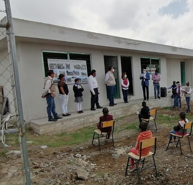funcionarios visitaron el jardín de niños Ma. Luisa Castañeda, donde se construyó una techumbre con una inversión de 234 mil pesos, de los cuales, 200 mil fueron otorgados por el Gobierno de México y el resto por las presidencias de comunidad y municipal, así como por los padres de familia.