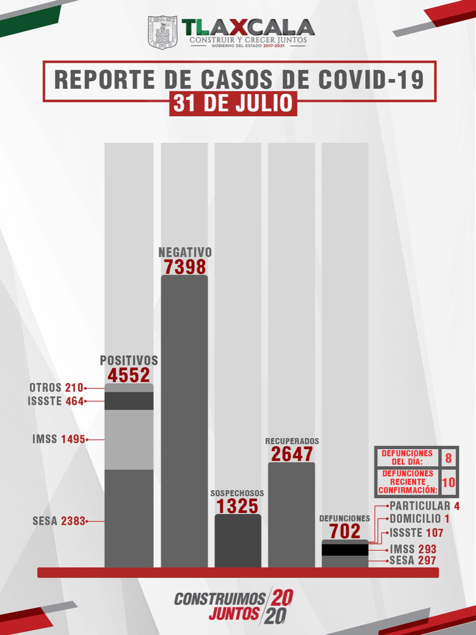 De acuerdo con el reporte de este sábado, la Secretaría de Salud del Estado (SESA) confirmó 36 personas recuperadas, 70 casos positivos más y 8 fallecimientos de Covid-19 en Tlaxcala.