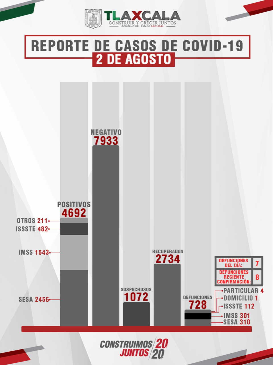 De esta manera, el estado registra dos mil 734 personas recuperadas, cuatro mil 692 casos positivos y 728 fallecimientos.