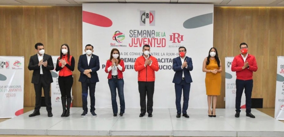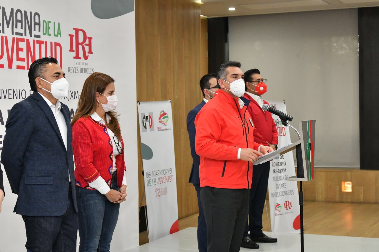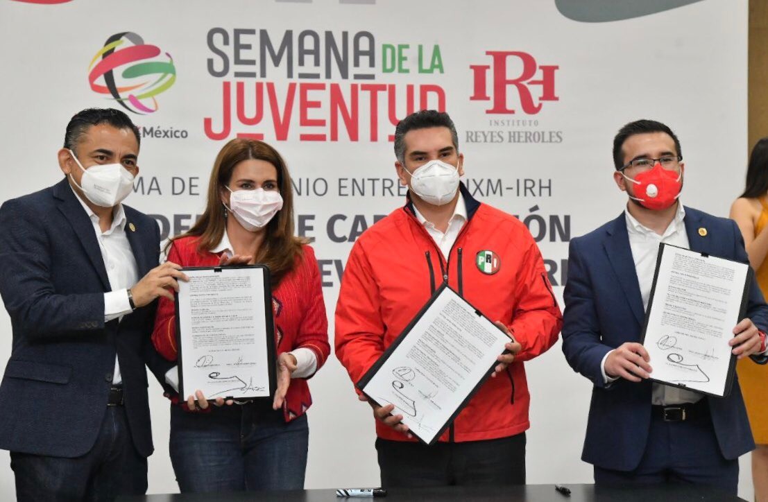 En compañía de la Secretaria General del CEN, Carolina Viggiano, Alejandro Moreno participó como testigo de honor en la firma del convenio de creación de la Academia de Capacitación para Jóvenes Revolucionarios, de la Red Jóvenes X México (RJXM) y el Instituto Reyes Heroles (IRH), que presiden Hiram Hernández Zetina y Lázaro Jiménez Aquino, respectivamente.