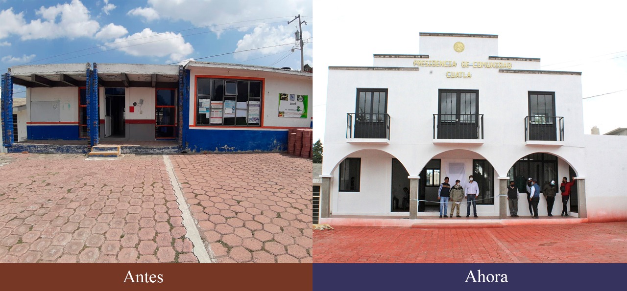 Ahora se cuenta con un inmueble rehabilitado y ampliado, que permitirá dar una mejor atención a la población; la construcción consta de dos plantas, con dos salones de usos múltiples, 3 baños, oficina para el comité de agua potable, y la oficina del presidente de comunidad. El presidente de comunidad de Cuatla, Santos Beristaín Nava, dijo sentirse muy contento y agradecido por ésta obra, que es para el beneficio de toda la comunidad, mencionó que durante su administración se han destacado dos obras de gran magnitud, una es la gestión del adoquínamiento de 6 mil metros cuadrados en la calle 21 de marzo, la segunda es la rehabilitación total de la presidencia de Comunidad; “agradezco al presidente municipal Eugenio Sánchez, por fijarse en Cuatla y priorizar estás obras, en conjunto con los compañeros del cabildo, manteniendo el compromiso con la ciudadanía que creyó en mí, y seguiré trabajando por mi comunidad y sociedad”