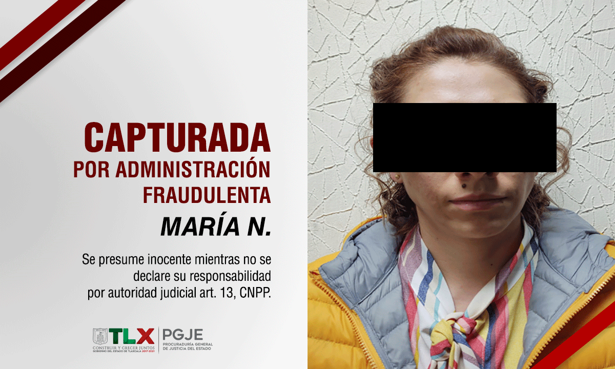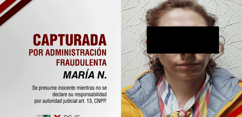La Procuraduría General de Justicia del Estado (PGJE) a través de la Policía de Investigación logró la captura de María N., quien contaba con una orden de aprehensión en su contra por el delito de administración fraudulenta.