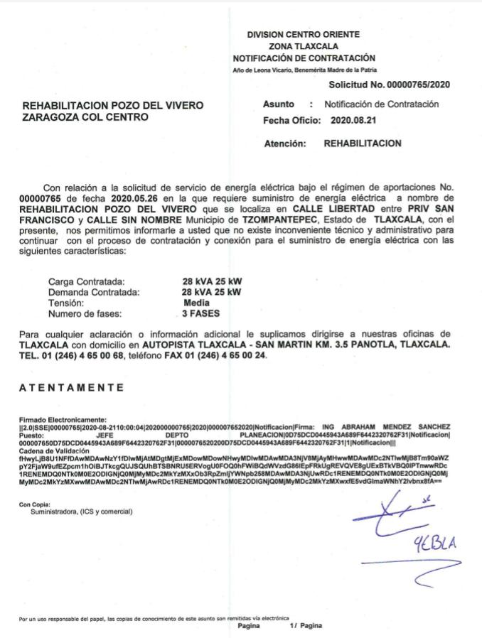 Es por ello que la administración que encabeza Arturo Rivera Mora a través de la dirección de Obras Públicas y Tesorería, han erogado ya al 100% las cantidades a pagar ante la CFE, así mismo realizado todos los permisos y documentación para dejar restablecido en una totalidad el servicio del pozo, dejando un precedente histórico para Tzompantepec y no dejar herencias de problemáticas en gobiernos futuros.