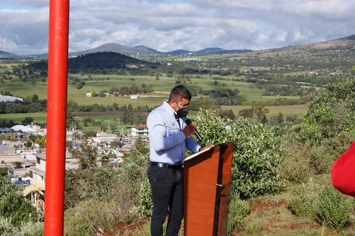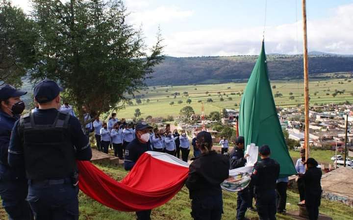 El presidente municipal de Lázaro Cárdenas, Tlax., Jaciel González Herrera, acompañado de los integrantes del cabildo y personal administrativo del ayuntamiento que encabeza, el Izamiento de la bandera, en el asta que se encuentra en la parte mas alta del municipio, este 1 de septiembre.
