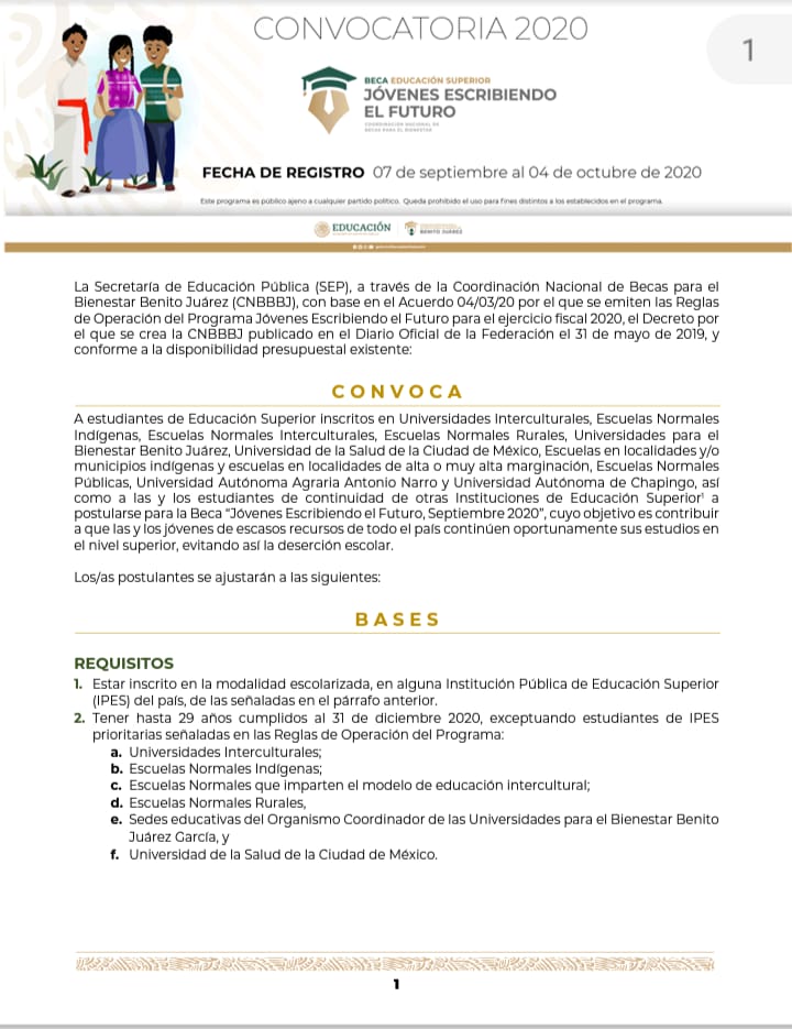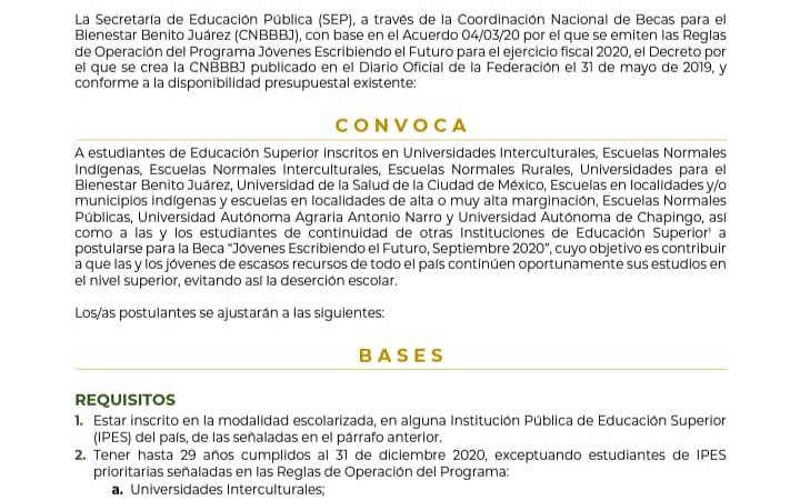 Por lo anterior, se convoca a estudiantes de Educación Superior inscritos en Universidades Interculturales, Escuelas Normales Indígenas, Universidades para el Bienestar Benito Juárez o públicas en general a postularse para la Beca “Jóvenes Escribiendo el Futuro, Septiembre 2020”, cuyo objetivo es evitar la deserción escolar.