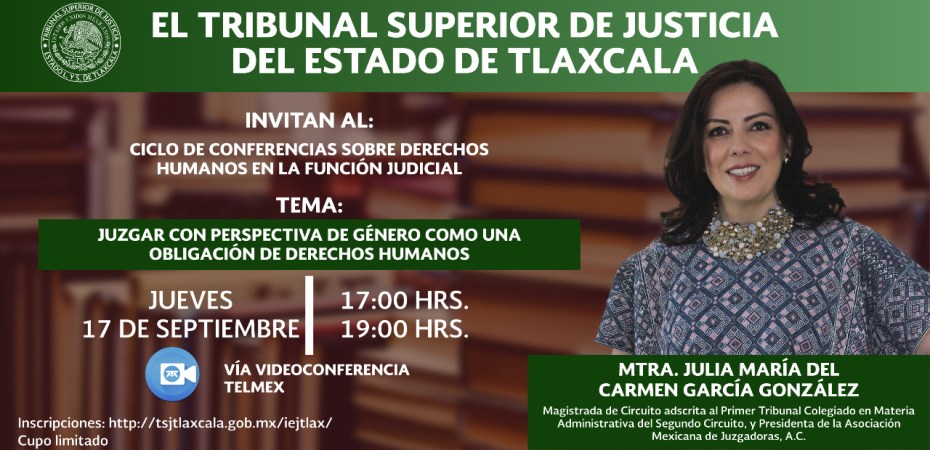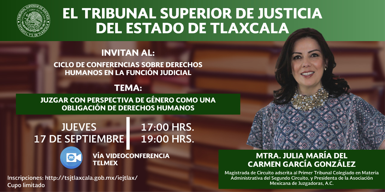 El Tribunal Superior de Justicia en el Estado (TSJE) continuará el próximo jueves con el ciclo de videoconferencias denominado “Derechos Humanos en la Función Judicial”, con la participación de la magistrada de circuito adscrita al Primer Tribunal Colegiado en materia Administrativa del Segundo Circuito y presidenta del Asociación Mexicana de Juzgadores, A. C., Julia María del Carmen García González, quien disertará la ponencia “Juzgar con perspectiva de género como una obligación de derechos humanos”.