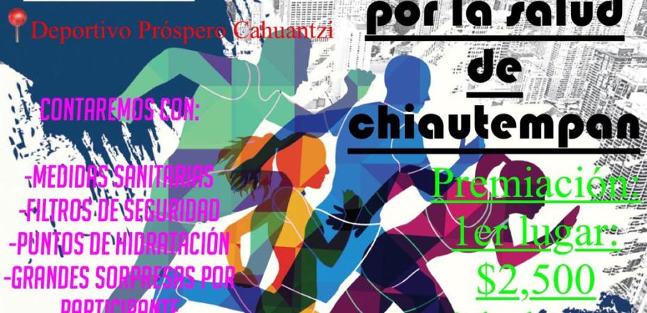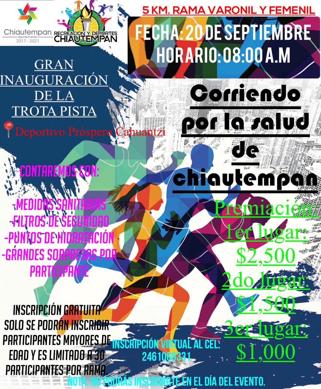 El Ayuntamiento de Chiautempan que preside Héctor Domínguez Rugerio, a través de la Dirección de Recreación y Deporte hacen la cordial invitación a participar en la Carrera Atlética denominada “Corriendo por la Salud de Chiautempan” que se llevará a cabo este domingo 20 de septiembre a las 8:00 hrs partiendo del estadio Próspero Cahuantzi, la cual contará con todas las medidas de seguridad e higiene necesarias, con un filtro sanitizantes y puntos de hidratación.
