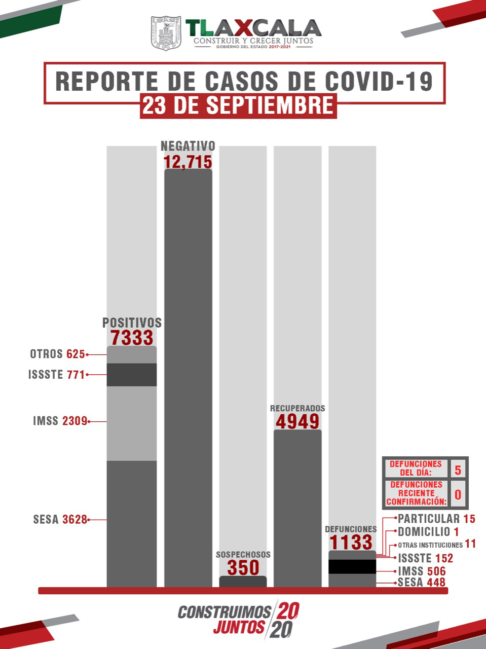 De acuerdo con el reporte del 23 de septiembre, la Secretaría de Salud del Estado (SESA) confirmó 49 personas recuperadas, 5 fallecimientos y 31 casos positivos de Covid-19 de tlaxcaltecas identificados en el estado y 7 en otras entidades.