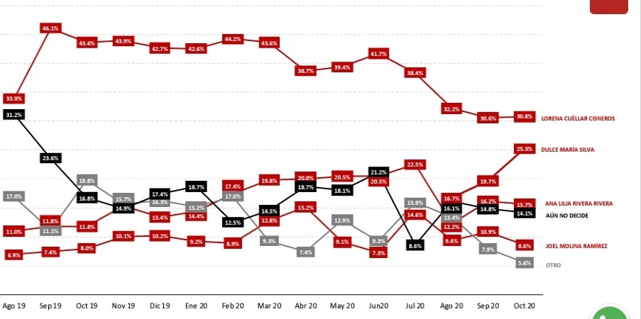 En los resultados que arrojo dicha consulta, del mes de octubre, se puede ver como la empresaria huamantleca, sigue subiendo en las preferencias de la ciudadanía y en especial en entre los afines al Partido de Movimiento de Regeneracion Nacional, ya que pasó de tener una preferencia en el mes de septiembre de 19.7 por ciento, a tener un 25.3 por ciento, lo que representa un 5.6 por ciento de mayor intención de voto a favor de Dulce Silva.