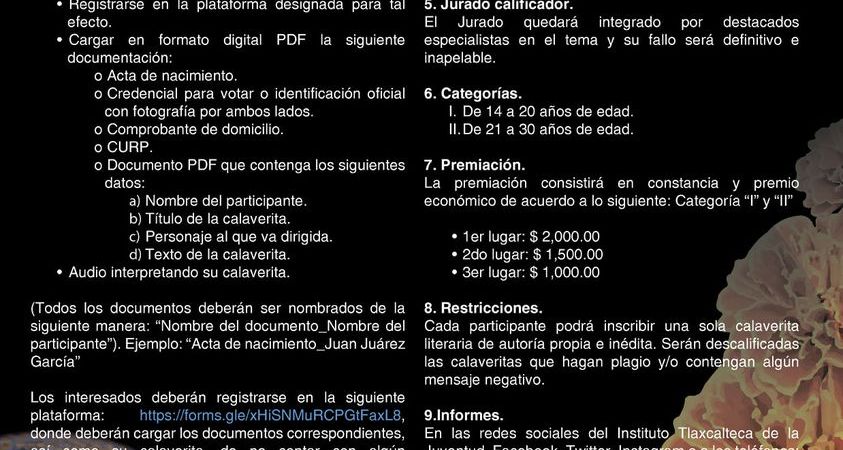 La fecha límite para poder inscribirse es el 26 de octubre del presente año a las 23:59 horas, las calaveritas literarias, deberán de estar dedicadas a personajes históricos tlaxcaltecas, la misma convocatoria señala que cualquiera de las obras que contenga algún aspecto negativo o contrario a la convocatoria será descalificada de manera inmediata.