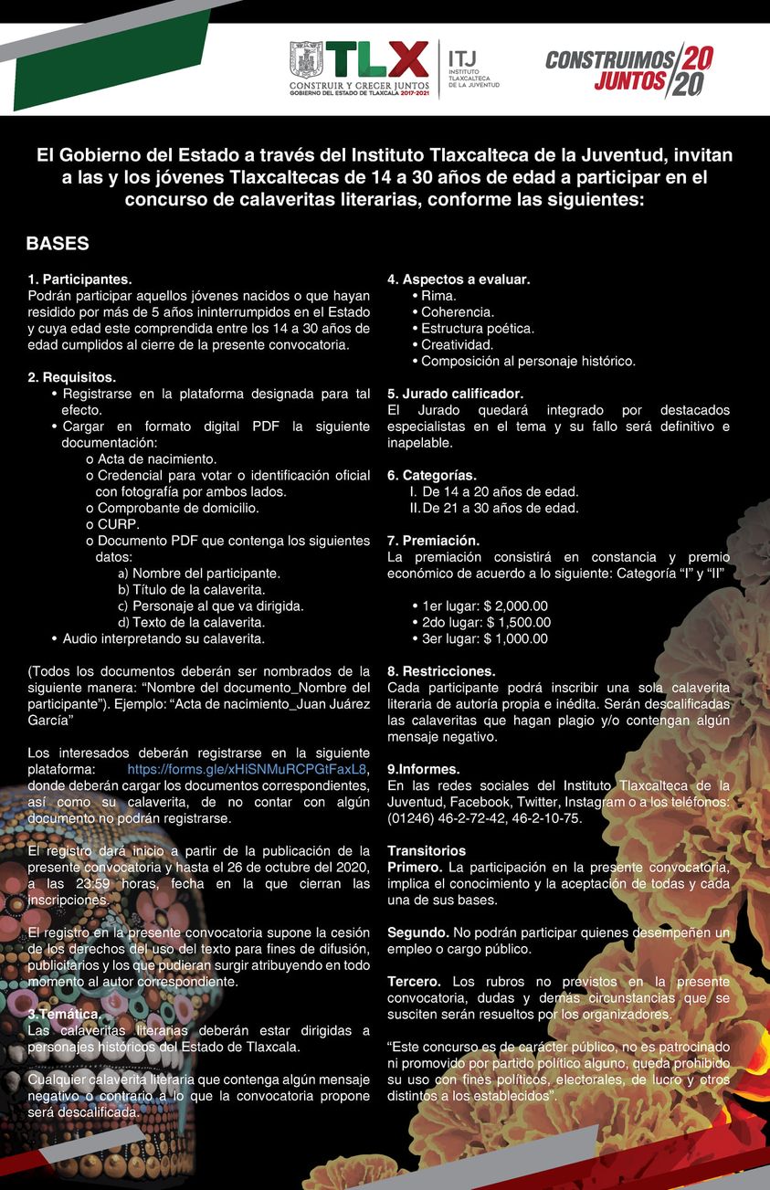 El gobierno municipal de Xaltocan, que encabeza Eugenio Sánchez Amador, en coordinación con el Instituto Tlaxcalteca de la Juventud (ITJ), invitan a las y los jóvenes xaltoquences de 14 a 30 años de edad a participar en el concurso de calaveritas literarias, que convoca la dependencia estatal.