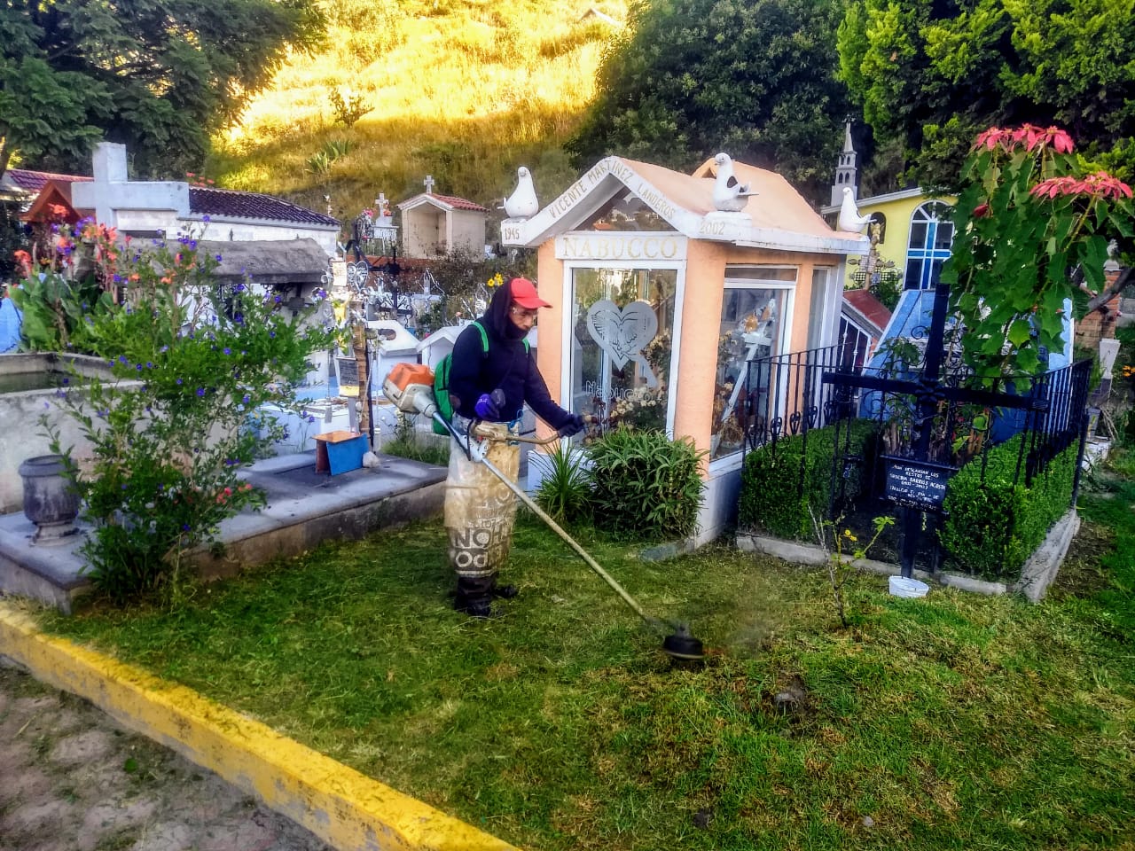 La Dirección de Servicios Públicos del Ayuntamiento de Tlaxcala realiza trabajos de limpieza y mantenimiento en panteones de diversas comunidades y de la ciudad capital, a fin de brindar espacios en buenas condiciones para quienes acudan a visitar a sus seres queridos en estas fechas de Día de Muertos y Todos Santos.