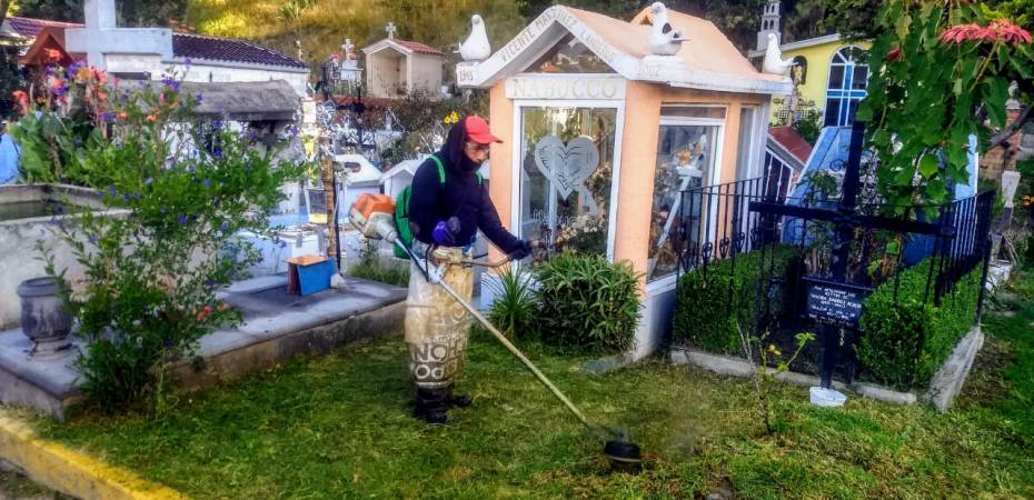 La Dirección de Servicios Públicos del Ayuntamiento de Tlaxcala realiza trabajos de limpieza y mantenimiento en panteones de diversas comunidades y de la ciudad capital, a fin de brindar espacios en buenas condiciones para quienes acudan a visitar a sus seres queridos en estas fechas de Día de Muertos y Todos Santos.