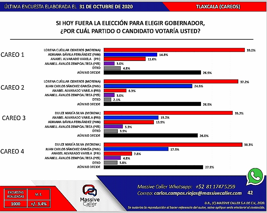 Massive Caller levantó mil encuestas el pasado 31 de octubre, con un error estadístico de +- 3.4 por ciento. Las encuestas se aplicaron bajo la técnica de robot en grabaciones enviadas a los hogares y contestadas por los propios entrevistados.