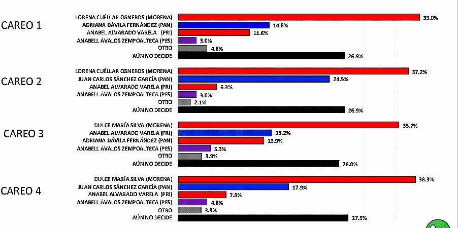 Lorena Cuéllar Cisneros (39 y 37.2) y Dulce Silva Hernández (35.7 y 38.3) se encuentran en empate técnico en los cuatro careos realizados el 31 de octubre por Massive Caller y publicados el uno de noviembre de 2020 en su sitio web.