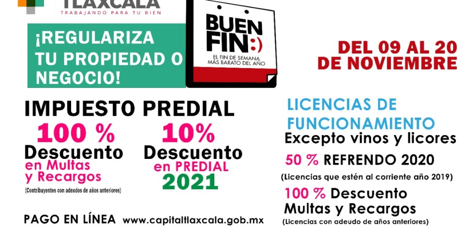 La Presidencia Municipal de Tlaxcala se sumará a la campaña del “Buen fin” del nueve al 20 de noviembre, por lo que mantendrá abierto el servicio de Tesorería para que los contribuyentes aprovechen descuentos del 10% en el pago al Impuesto Predial 2021 y del 100% en multas y recargos, podrán efectuar sus pagos en un horario de 09:00 a 14:00 horas de lunes a viernes con las debidas medidas sanitarias para evitar contagios de Covid-19.